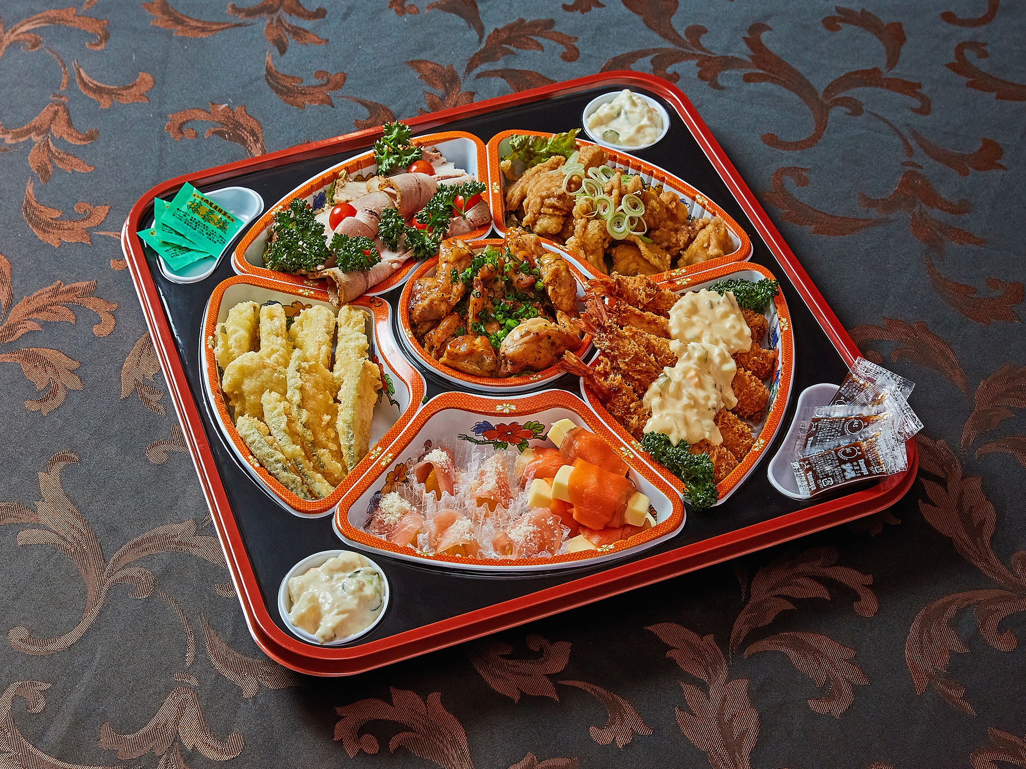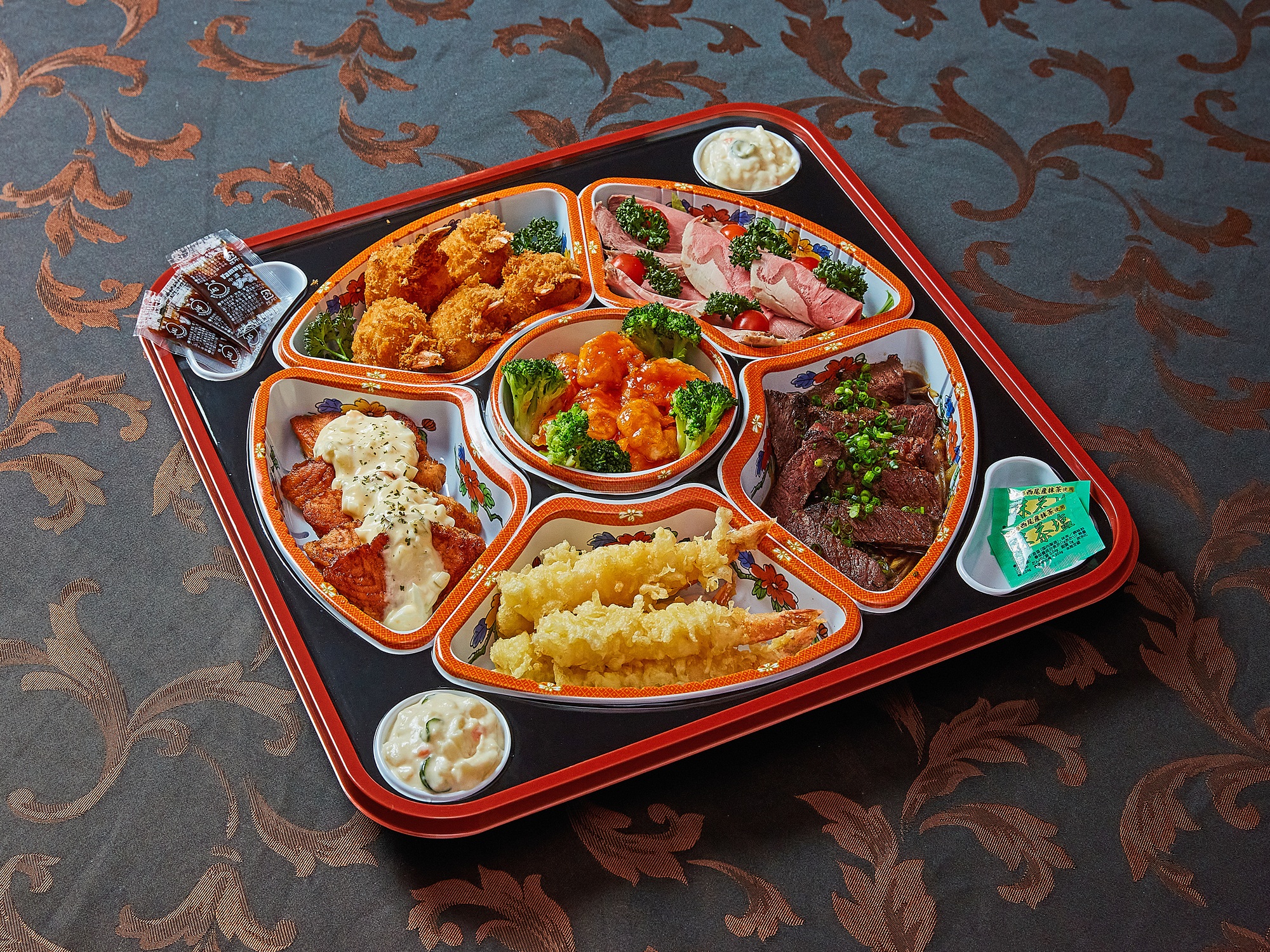 | 天ぷら(南瓜、湯葉巻)・エビフライ・ローストポーク・ガーリックチキン・香味チキン・チーズのサーモン巻・生ハムマンゴー | ||